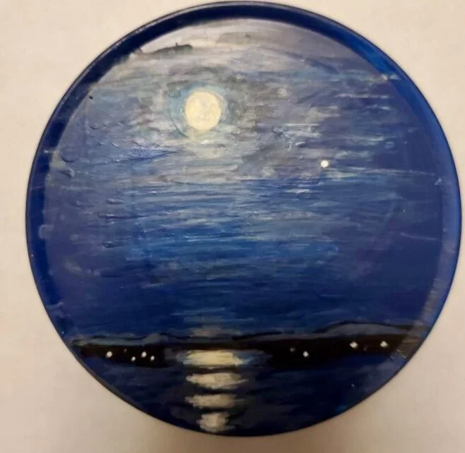 All photos and paintings by author. Acrylic on repurposed aluminum lids.
